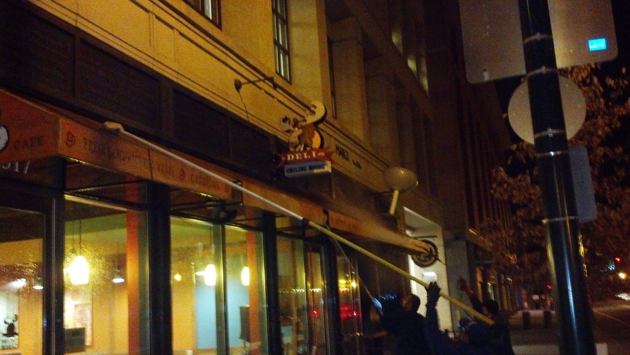 Since awnings are usually on the front of the building over the entrance, they usually have to be cleaned when the business is closed. So last week we were downtown in the wee hours of the morning before the sun came up.