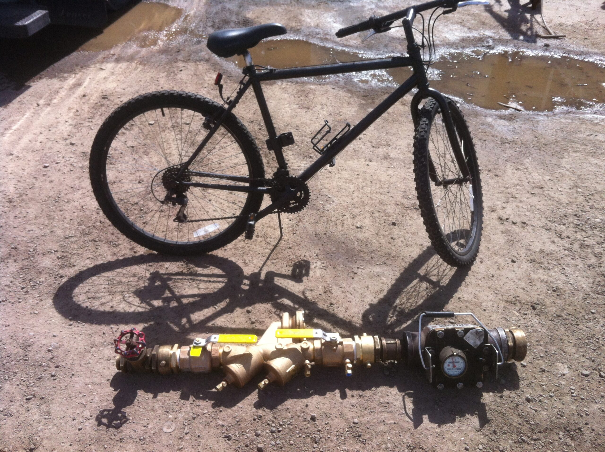 Bike shows size of new backflow pressure assembly on Denver Water hydrant meter
